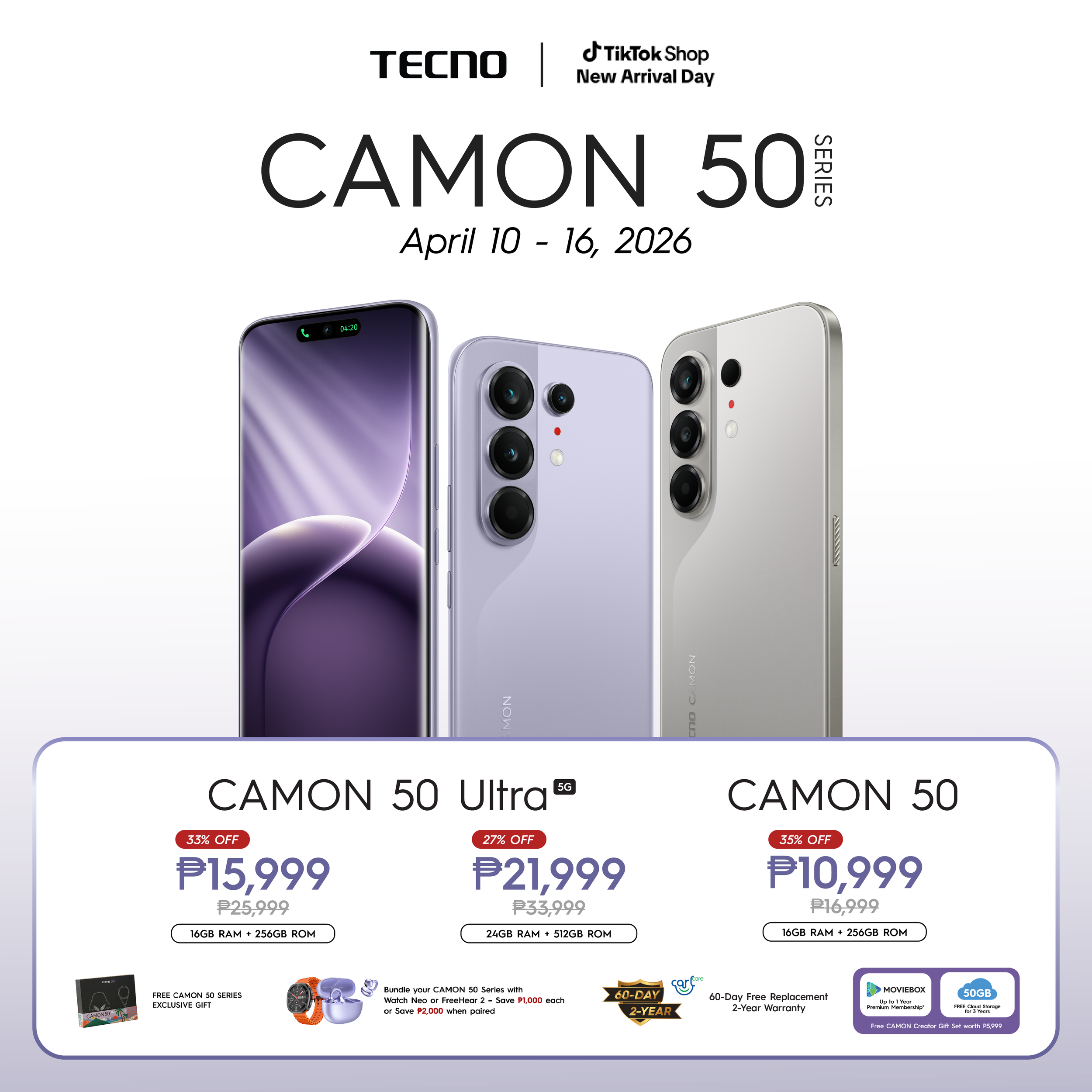 Following the massive success of its offline pre‑order, TECNO launches the CAMON 50 Series on the country’s top e‑commerce platforms. From April 10 to 16, Filipino shoppers can grab exclusive CAMON 50 Ultra 5G variants, creator-focused freebies, and wearable bundle savings across TikTok Shop and Shopee at irresistible flash sale prices.